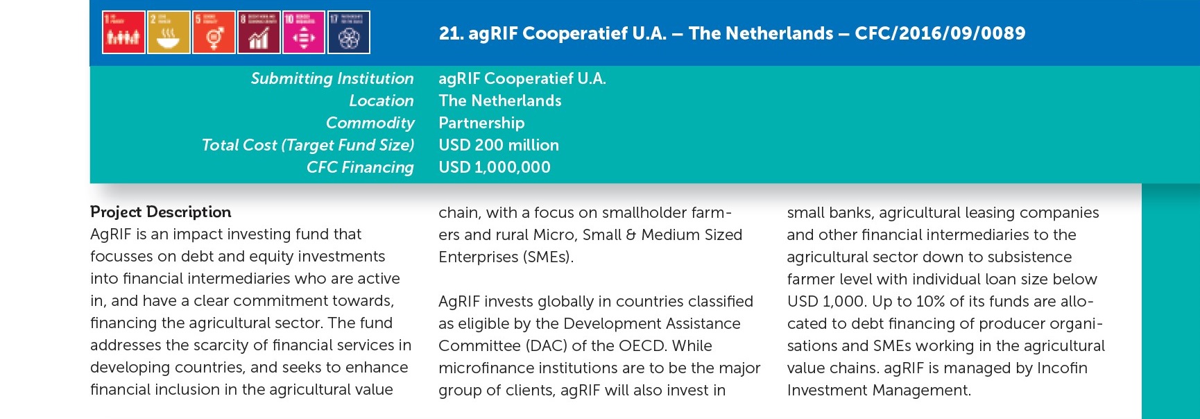 The CFC has funded projects addressing over 70 different commodity products, in partnership with investment funds and equity investors. The commodities funded include abaca, arachis, bamboo and rattan, bananas, cashews, cassava, castor seeds, citrus, cocoa, coconuts, coffee, coir, copper, cotton, fish, fonio, groundnuts, gum arabic, hides and skins, jute, lead, maize, meat and livestock, medicinal herbs and plants, olives, palm oil, paprika, potatoes, rice, natural rubber, shea nuts, sisal, sorghum and millet, soybean, cane sugar, tea, timber, tropical fruits, spices, and zinc. Most of these are produced almost entirely in developing countries and in partnership with investment funds, among which are the Africa Agriculture & Trade Investment Fund (AATIF), African Agriculture SME Fund, Eco Enterprises Fund, Moringa Agro-forestry Fund, SME Impact Fund, and agRIF Cooperatief U.A.